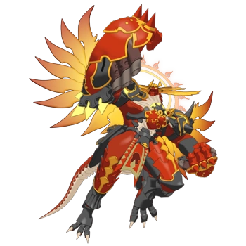 As Fourth Omni Fire Lord, Burn Nova, his appearance is similar to that of Duel Sieger "Tempest Enforcer". He is a red dragon with beige accents that wears a golden crown with four horn-like extensions shaped like flames and "earrings" that are similar to those of old Chinese Emperors. The exhaust-like ports on the back of his body create "retractable" wings as well as a ring with a sun-like design. He sports gigantic red and golden gauntlets on his hands with spikes on his knuckles as well as grey armor with red an golden accents that cover his chest, his shoulders and his legs. He has four fingers on his clawed hands and three on his toes.