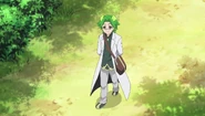 As Kakeru, he dons a white labcoat over a black top with brown highlights. His hair is dark green with 2 light green specks of hair on the top. On his shirt he has a clip-on black tie. He wears white like sweat pants and black and brown shoes matching his shirt.
